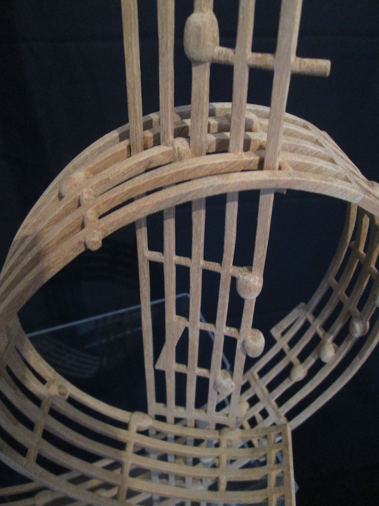 | Musik liegt in der Luft Diese Arbeit besteht aus einer Notenzeile mit 13 Takten, die zu einem Notenschlüssel verwunden ist. Das verwendete Musikstück ist die deutsche Nationalhymne. Am Ende der 4 Wochen, die ich zur Schaffung brauchte, hatte ich mehr Material als Abfall in der Werkstatt liegen, als noch am eigentlichen Werk vorhanden war. Diese Arbeit ist extrem fragil und nur für Selbstabholer, da ich keinem Logistiker genug Fingerspitzengefühl zutraue. Material: BangkiraiMaße: 41x121x40cm Preis: